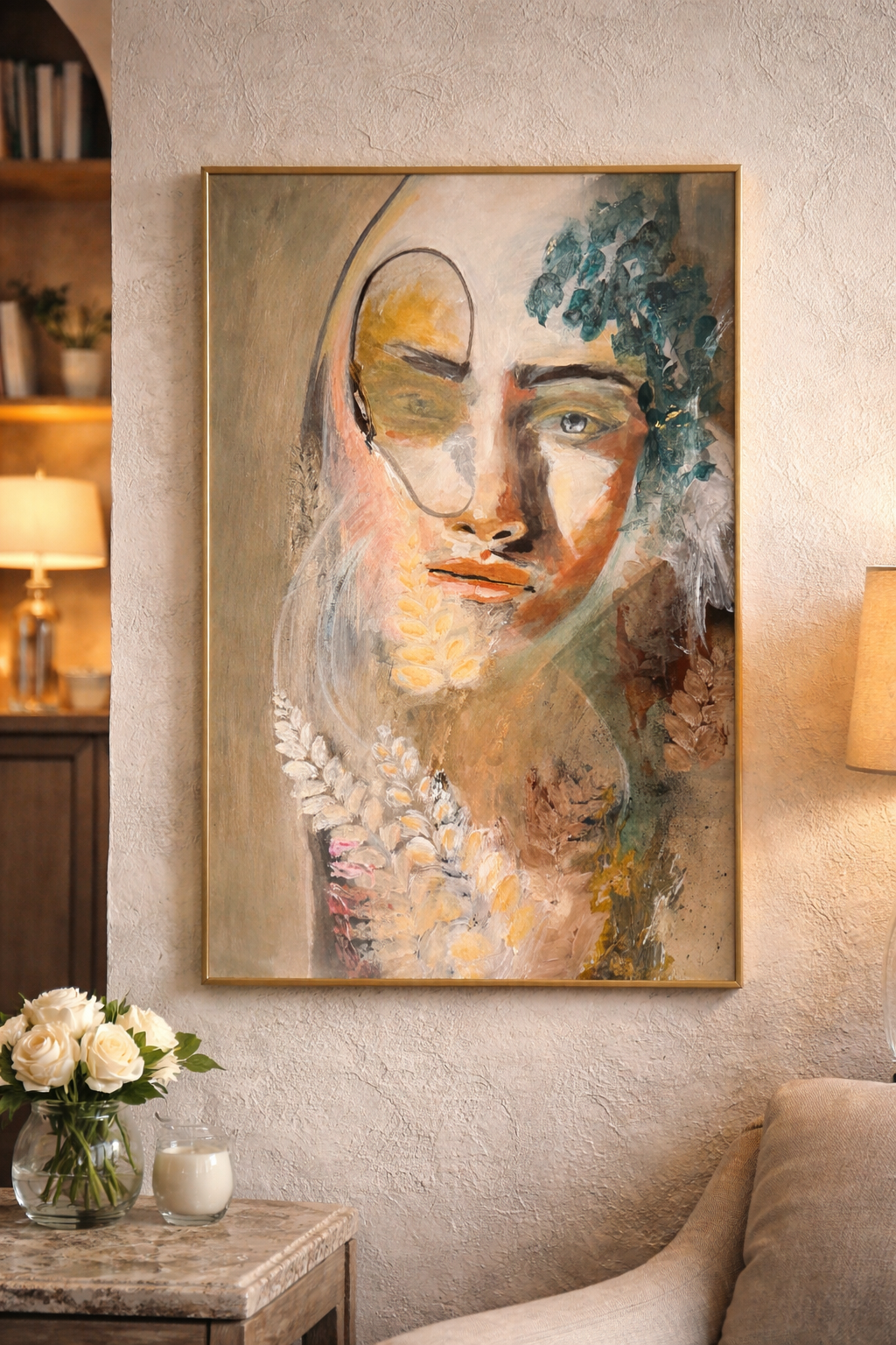 This painting reflects the quiet complexity of an inner journey, one that has no clear beginning or end. The fragmented face suggests layers of identity, constantly shifting between clarity and uncertainty. Soft textures and organic elements blend into the figure, symbolizing growth, memory, and the traces left behind by experience. The presence of nature within the portrait hints at resilience and transformation, as if the subject is both dissolving into and emerging from her surroundings. There is a tension between stillness and movement, between being lost and finding oneself again.