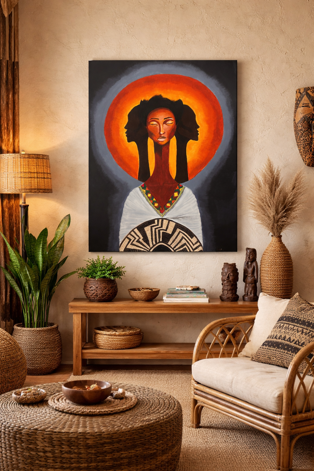 The warm halo of orange and red evokes both the sun and a spiritual aura, referencing energy, ancestry, and cultural continuity. Inspired by Afro-centric aesthetics, the elongated form and geometric patterns draw on traditions of strength, elegance, and heritage.